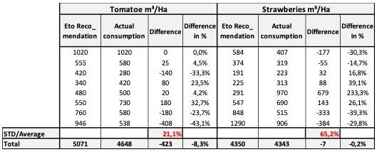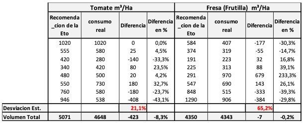Por otro lado, las diferencias en el timing se ven en la columna “Diferencia en %”. Por lo tanto, si regamos solamente en base a la Eto, conseguiremos un riego poco eficiente porque regaríamos a “destiempo”.o
